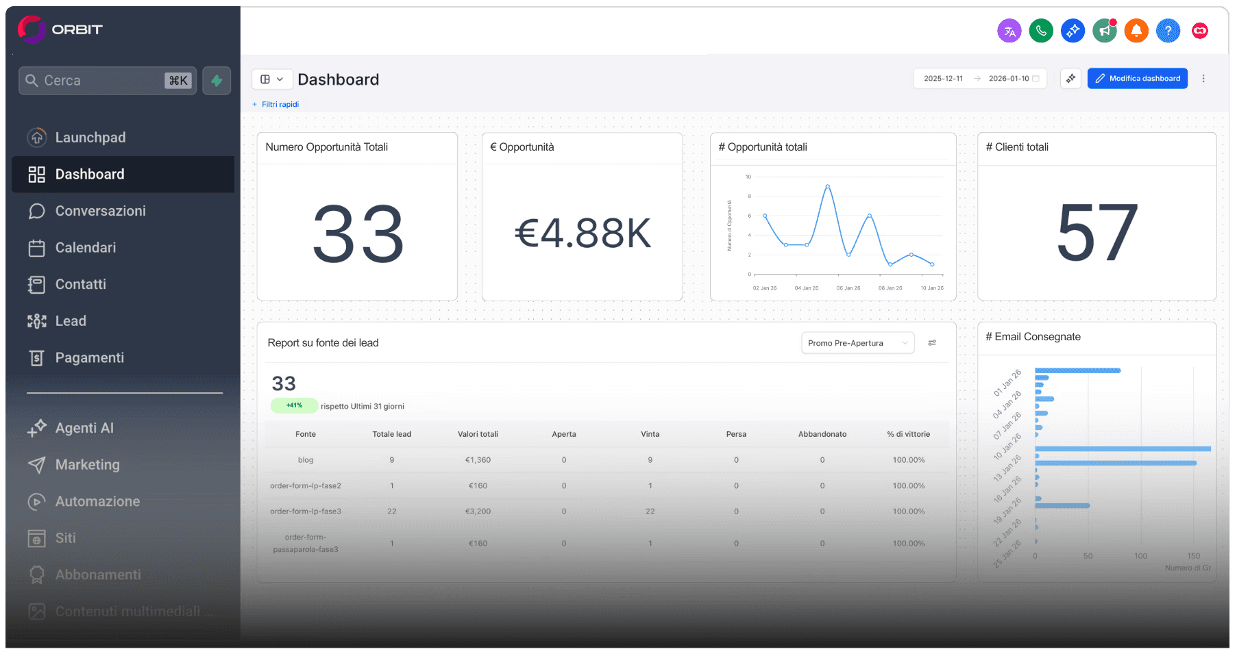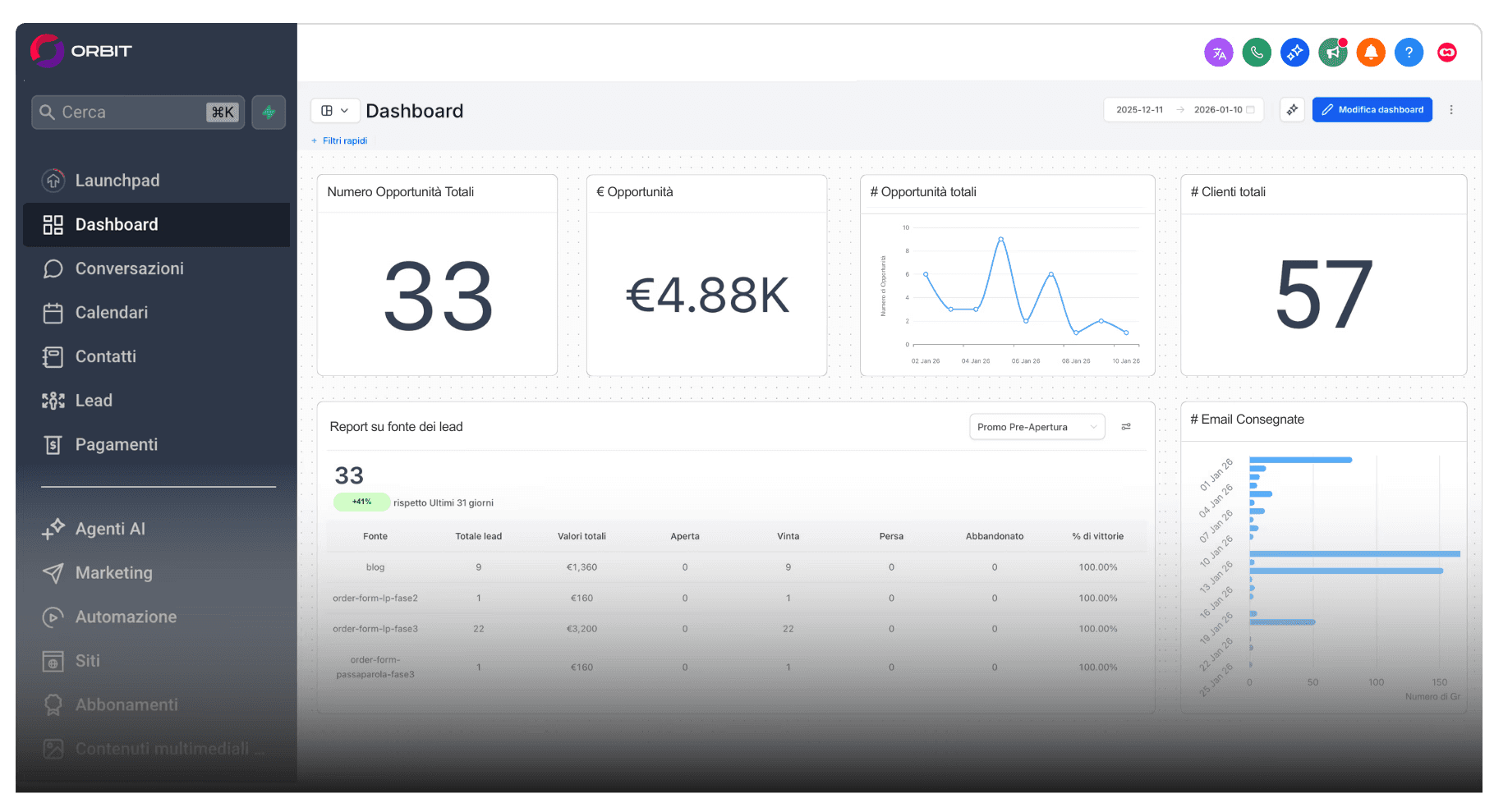 Un unico gestionale che integra CRM, marketing, automazioni, prenotazioni e messaggistica. Con Orbit centralizzi tutto in un ambiente coerente e personalizzabile: meno costi, meno caos, più efficienza.