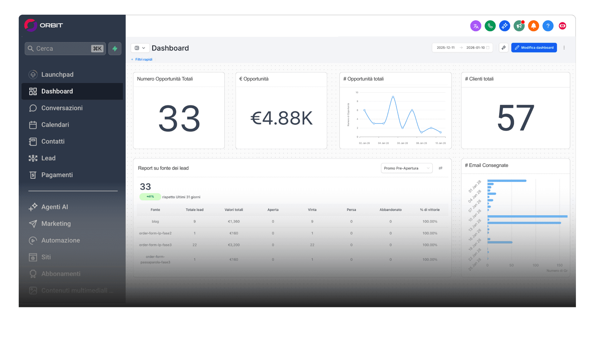 Un unico gestionale che integra CRM, marketing, automazioni, prenotazioni e messaggistica. Con Orbit centralizzi tutto in un ambiente coerente e personalizzabile: meno costi, meno caos, più efficienza.